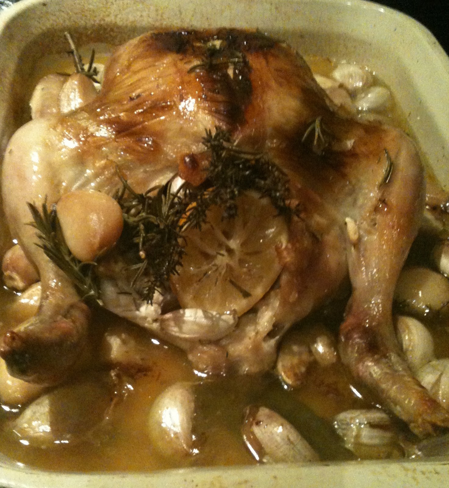 Heat the oven to 220C/gas mark 6. Un-truss the chicken. Often there are big lumps of fat just inside the cavity entrance, one on either side. Discard. Lavishly season inside the cavity with salt and pepper. Place 2 sprigs rosemary and thyme inside the cavity with 2 strips of lemon zest or in this case I placed 2 halves of a lemon. Place the chicken, breast side uppermost, in a large, lidded casserole dish that holds the chicken snugly. At this stage I put the chicken the the oven to brown the skin.