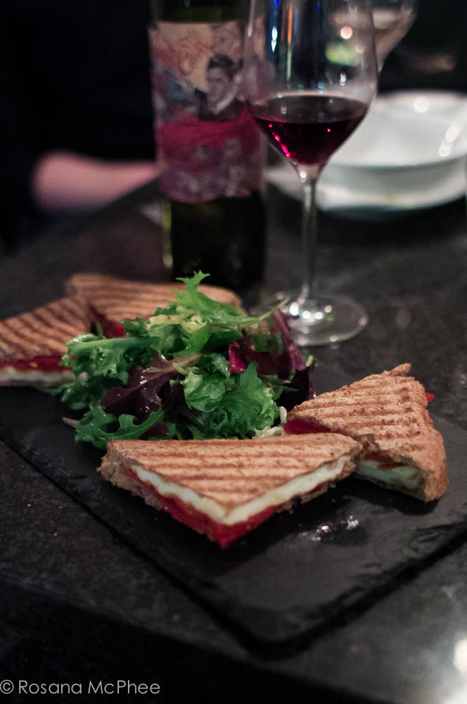 I must point out that the wines are not your run-of-the-mill tipples. The well curated list includes wine, prosecco; with some excellent options, there’s something for everyone on that list. Wines are sold by the glass 175ml (£6.50), garrafe 500ml (£17). If you are not a fan of wines, there’s a small selection of 6 cocktails (£8/each), beers (£5/bottle), cider (£5.5/bottle) and non-alcoholic drinks too. The menu also has a small variety of bar food – nibbles from £3, delicious charcuterie and cheese boards at £18 for 2 people and £35 for 4 people. I love the sourdough toasties (£7/each) – my favourite is the n’duja and burrata- comes with a green salad – excellent dressing!
