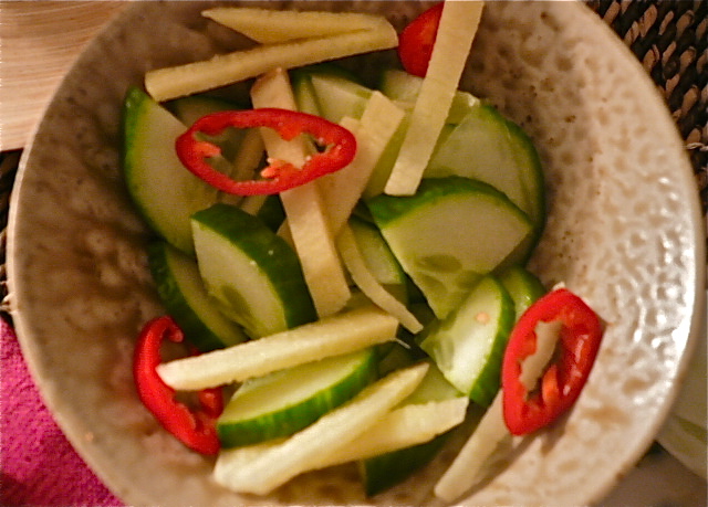 | fish bok choy with lime butter, Tofu in Mirin sauce, Aubergine in miso sauce, Mango salad with mint, cucumber pickle |
