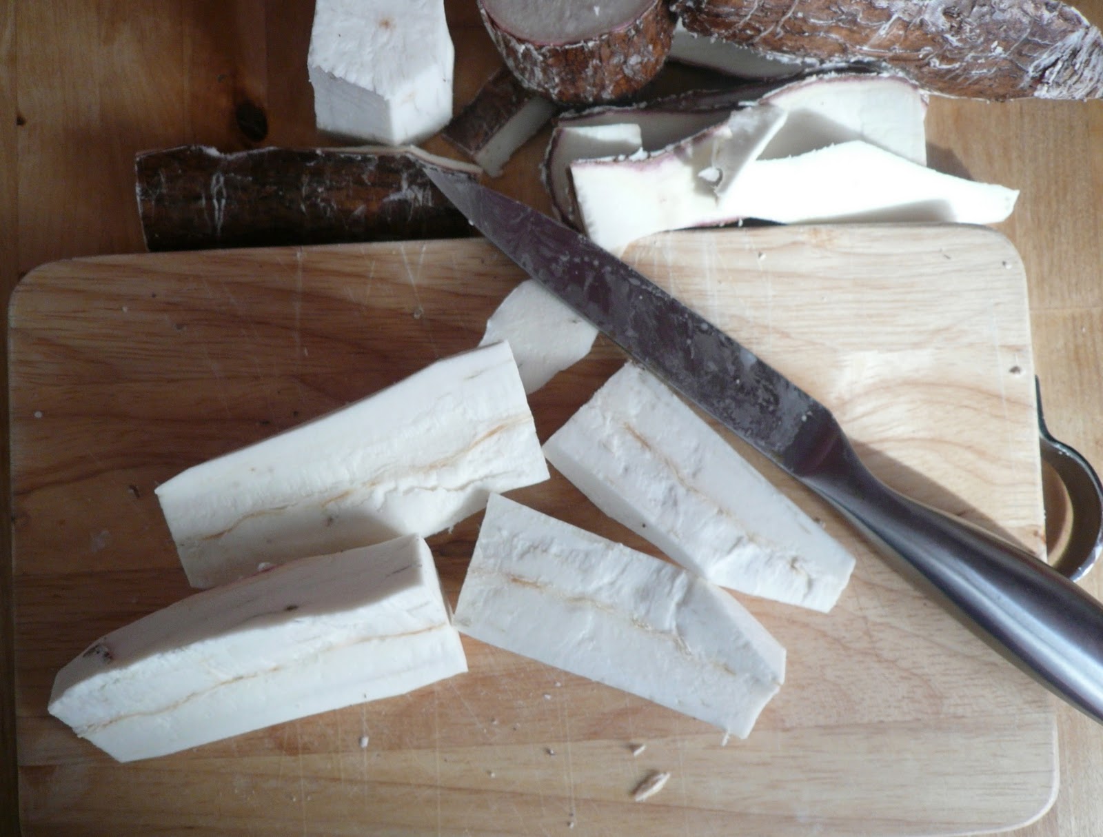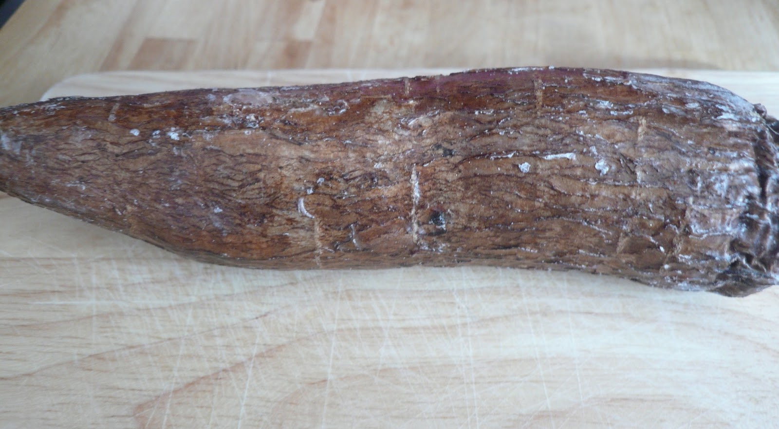 A woody vein runs along the root’s body. The flesh is chalk-white. Cassava roots are very rich in starchy and contain significant amounts of calcium.When buying cassava make sure the greengrocer chops it in half to make sure the cassava is white and it’s not spotty or stripey. They are widely available from Asian, African and Portuguese/Brazilian corner shops and markets in the UK. It can also be bought frozen, ready to use, from some Portuguese shops making life much easier indeed!