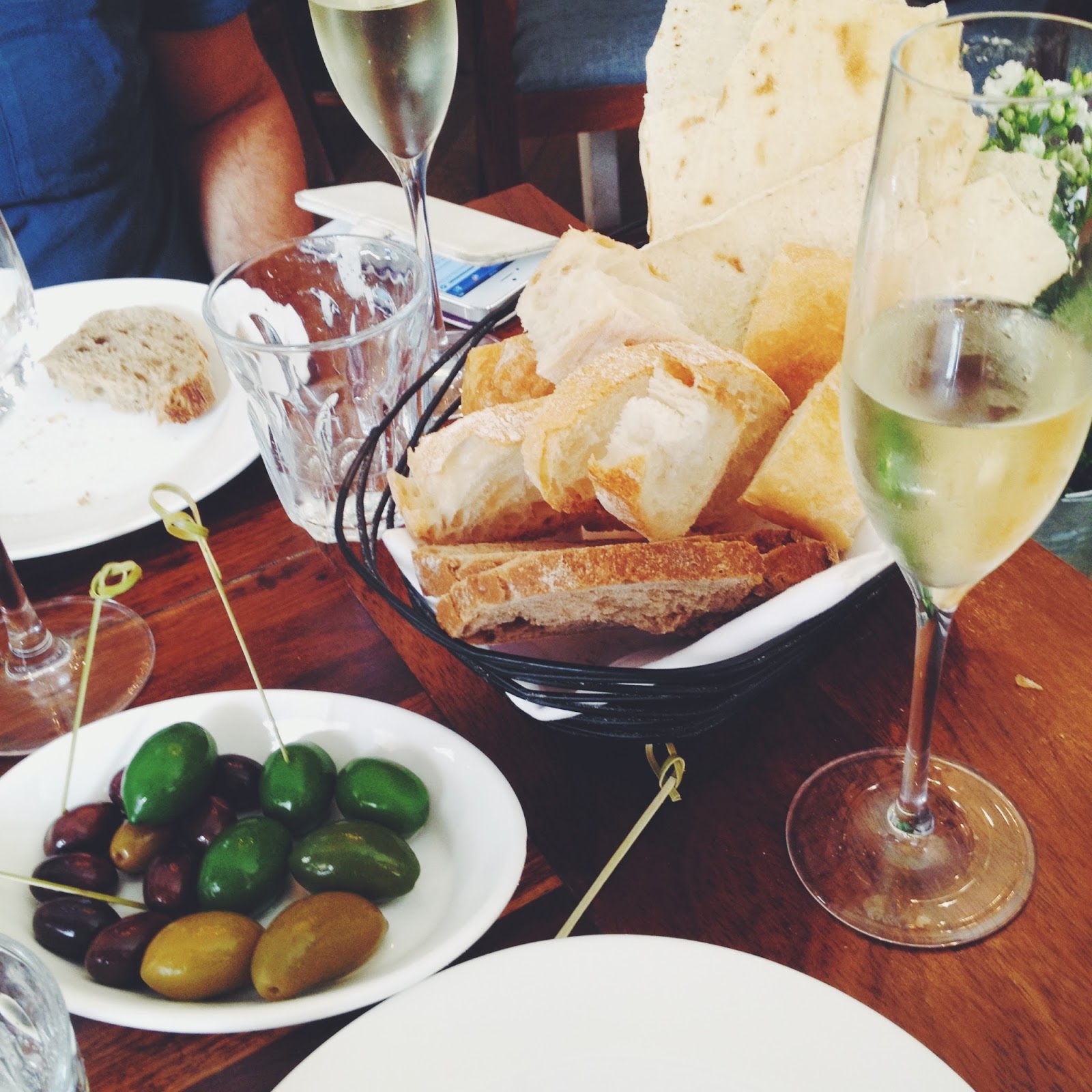 | Italian breads basket, delicious plump olives and a refreshing Prosecco |