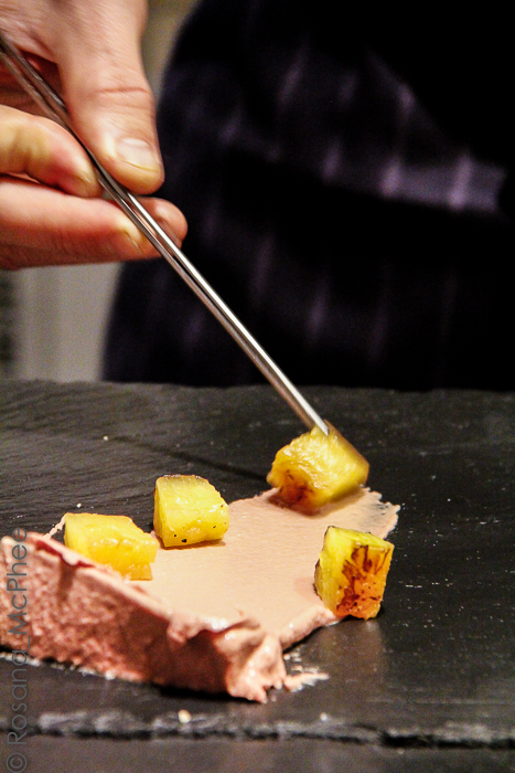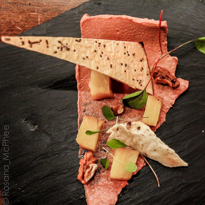 | Chicken parfait, charred pineapple and walnuts, black pepper flat bread – amazing! |
