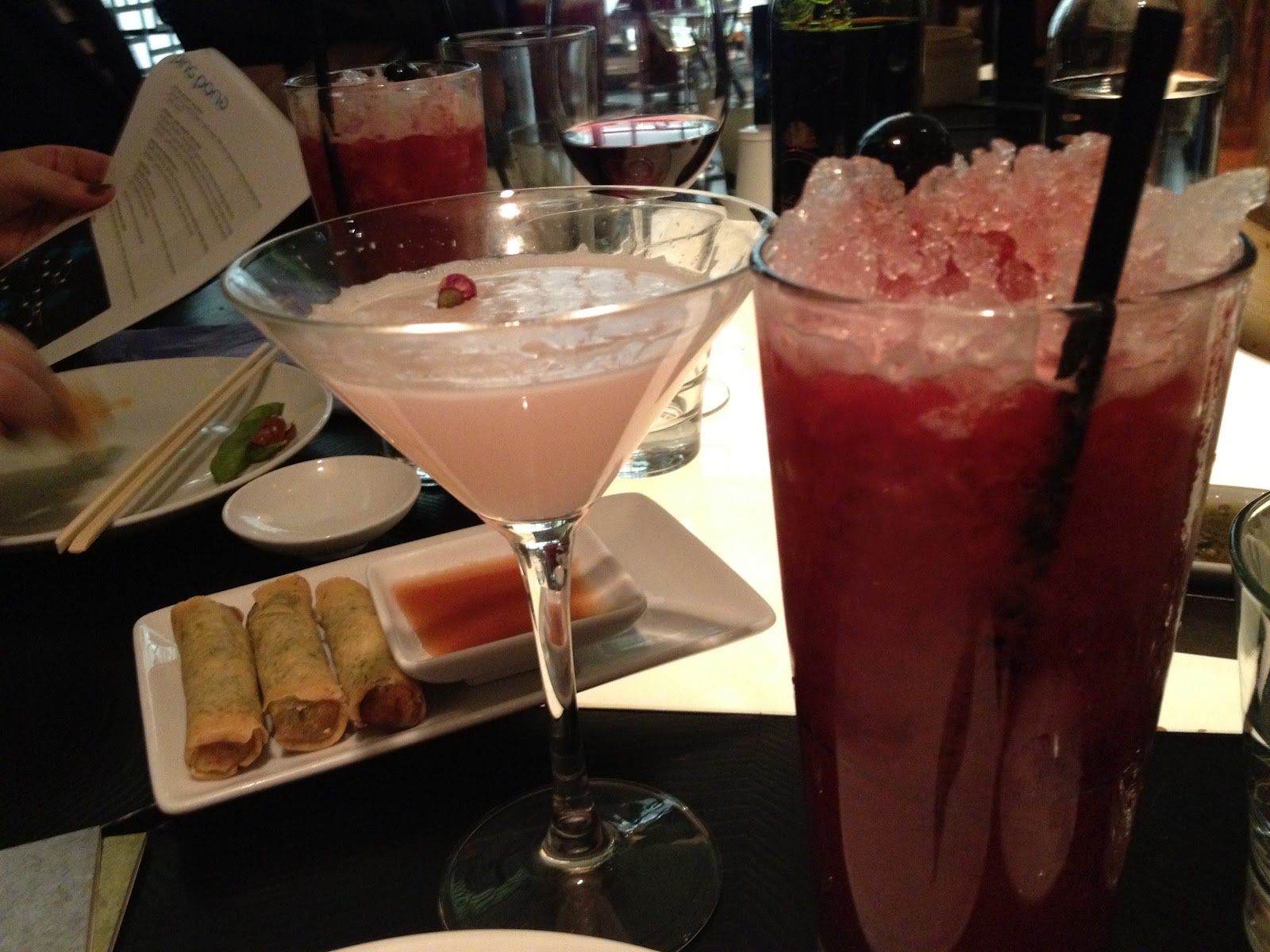 | Morello cherry tai iced tea: sweet tangy with spiced berries – morello cheery puree, lemon juice and jasmine iced tea – delicious long drink, in the background crunchy vegetable and tofu spring rolls with chilli sauce |