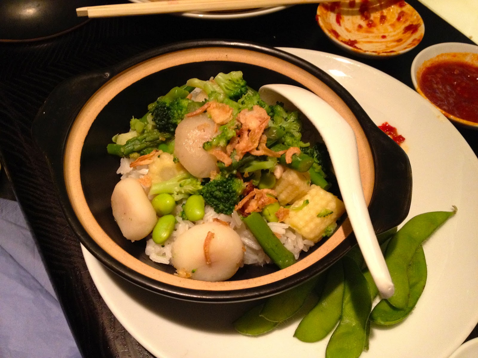 | Vegetarian option – delicious coconut and mushroom with water chestnuts and hint of citrus topped with fried shallots so tasty! |