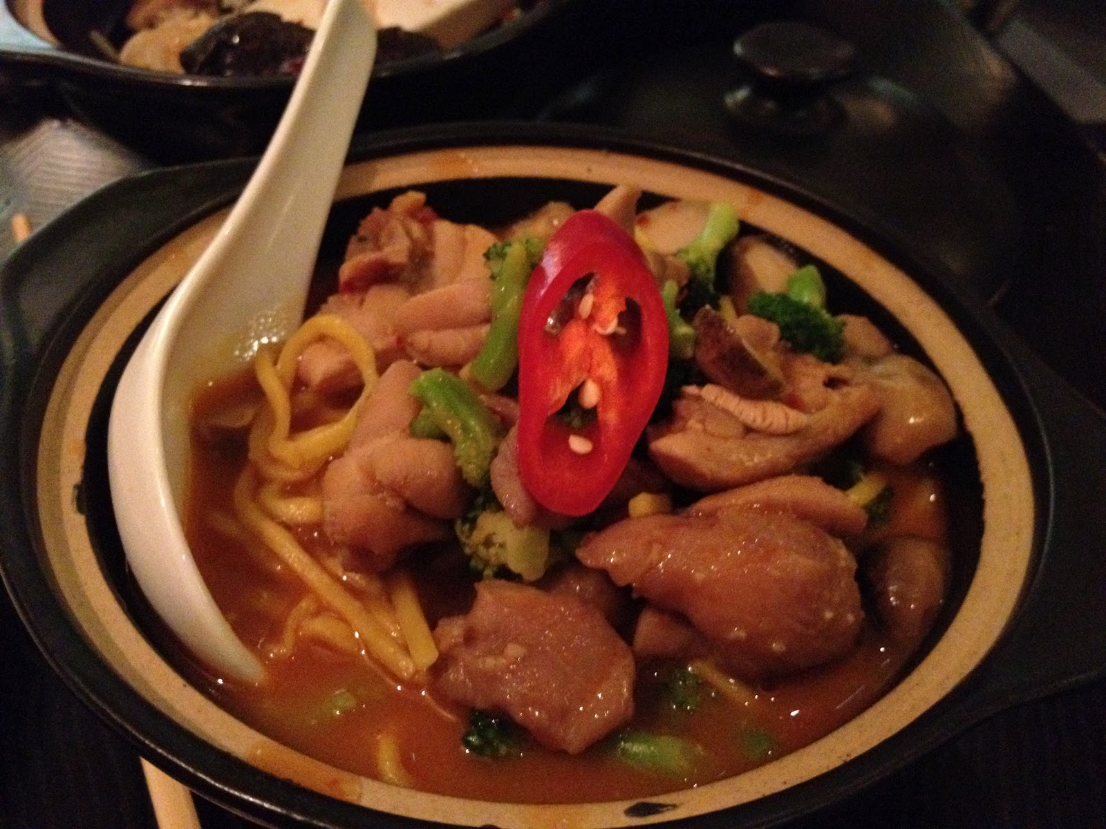 | Chicken and noodle sour soup – braised chicken, lemongrass, garlic, Chinese wine broth with egg noodles, straw mushroom, broccoli and chilli – wow! what a soup! Fabulous, warming and very filling! |