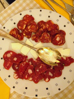 | Salame from Vibonati (Cilento region), ciambotta (above right), zucchine scapece (below left), served with two types of breads |