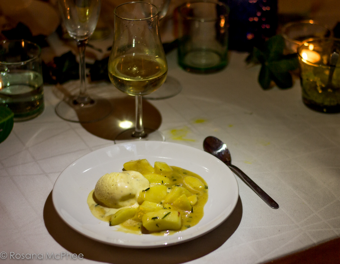 A creamy saffron fish soup with salmon, cod and shrimp served with fresh bread. The secret recipe by Felix and his dad – my favourite dish of the evening – so much so I was looking around to get some more!