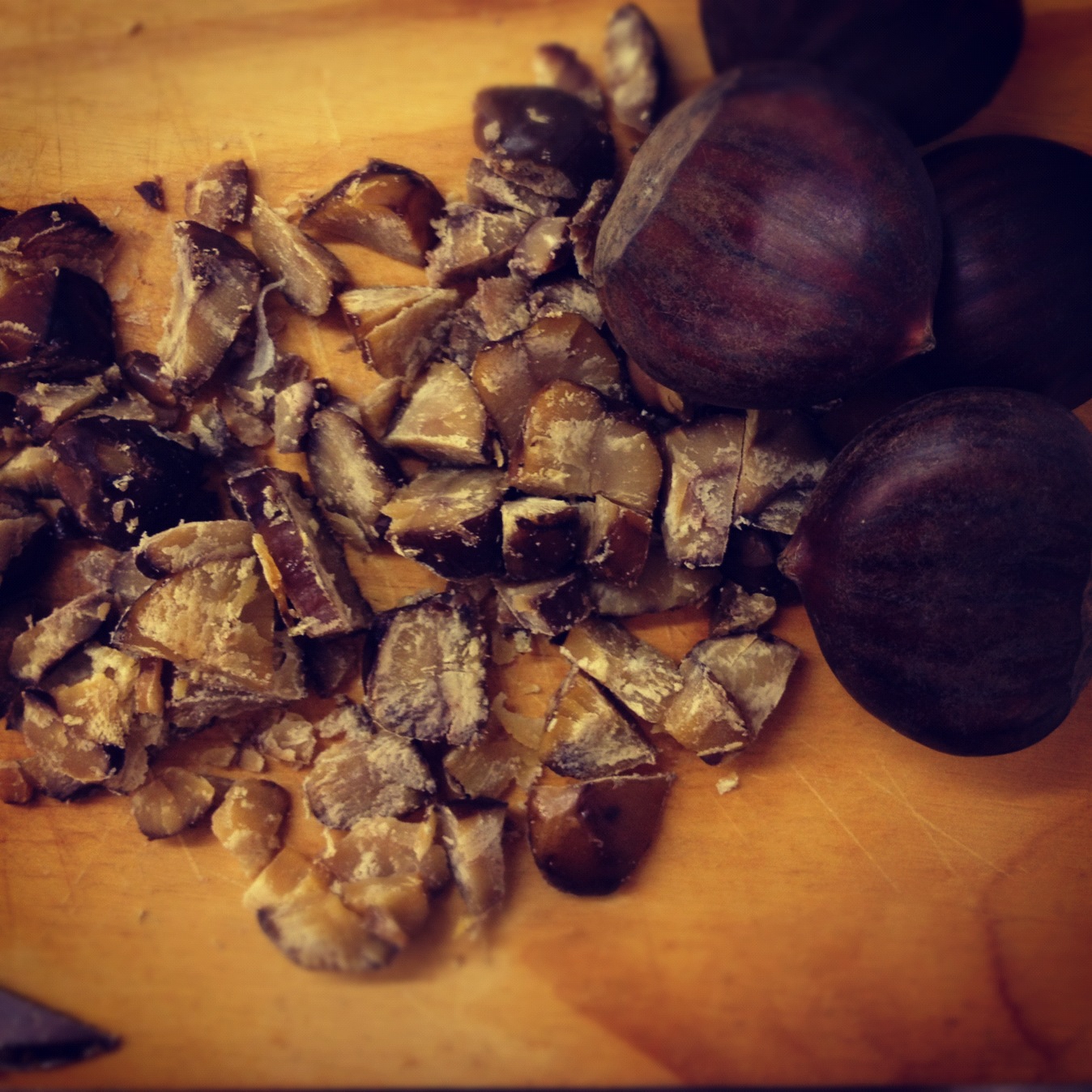 I´ve been to Theo Randall at The InterContimental Hotel and I really enjoyed meeting him, eating his rustic Italian food and his cookbook Pasta. When I saw this recipe at the Great British Chefs App I was eager to try it as part of our first meal of the year in Brazil, where is traditional to have a feast after the midnight celebratory fireworks. This is my second attempt to cook from this app in foreign soil. The ingredients were easy to find. The cooked chestnuts, the main ingredient in this dish, were bought already cooked in jar at the local supermarket, a bit expensive, but worth it. The recipe is described as a starter, but as we were having an informal help-yourself kind of meal, so I prepared it as a side dish. We had a mix of dishes at the table including some Brazilian chillies; farofa which is a Brazilian side dish made using cassava root coarse flour; lamb , chicken, seafood, nuts and dried fruits and of course plenty of sweet treats.