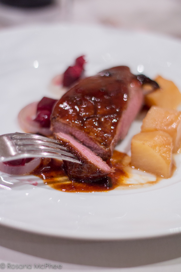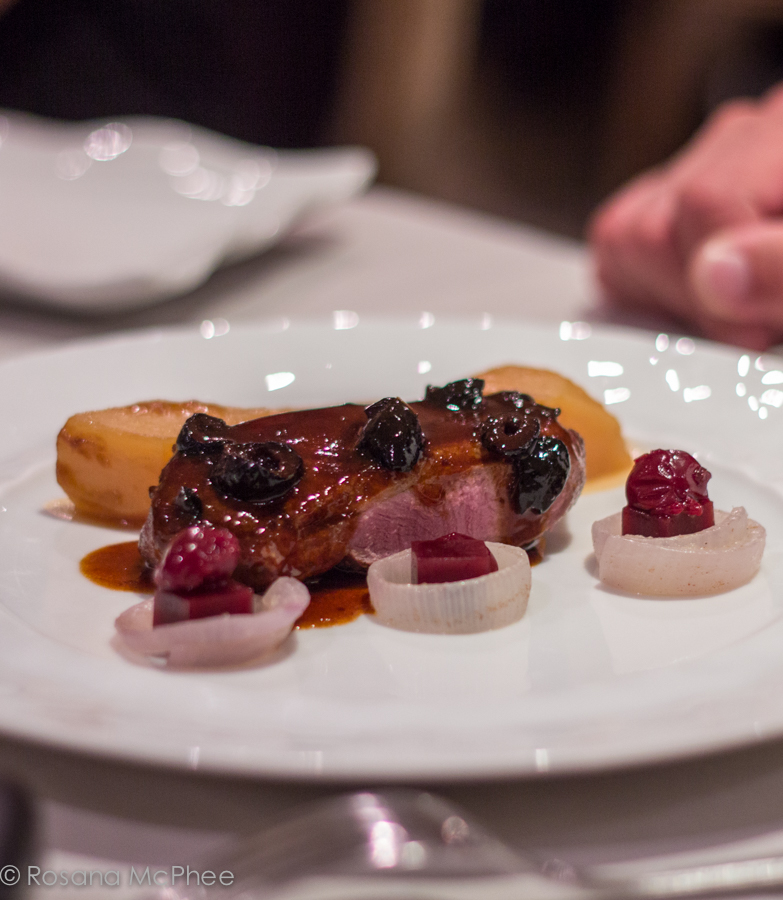 | filet de canette rotie sauce olives moires, griottes acidulées and pommes de terre fondants |
