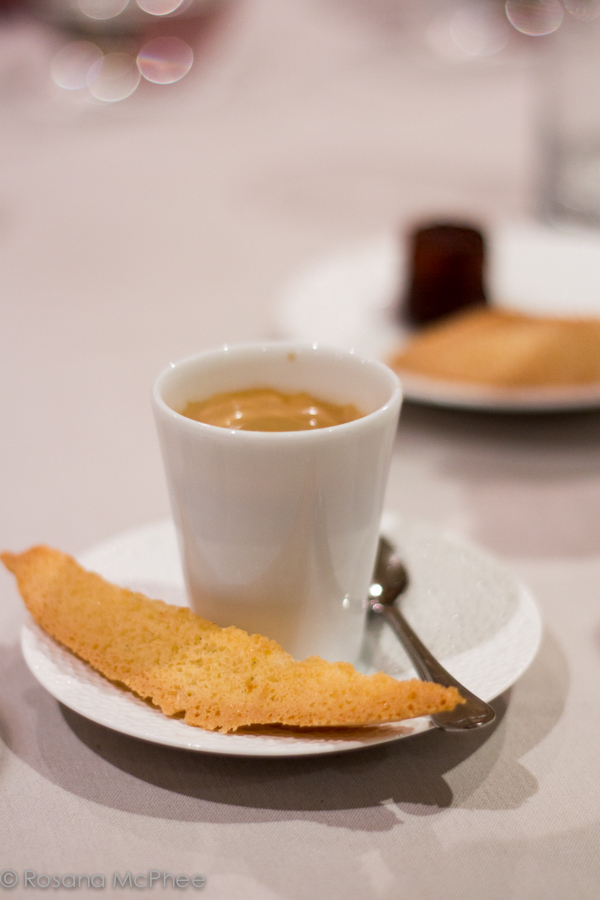 moelleux de foie blond de volaille (chicken liver) smooth and very tasty and filet de canette rotie sauce olives moires (duckling fillet roasted) with potato fondant with sour cheeries (griolles acidulees) – the duck was perfectly cooked and the sour cherries just lifted the dish.