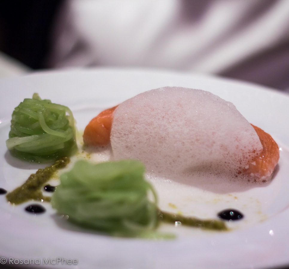 | salmon cooked at low temperature served with spirilezed cucumber and cardamom foam |