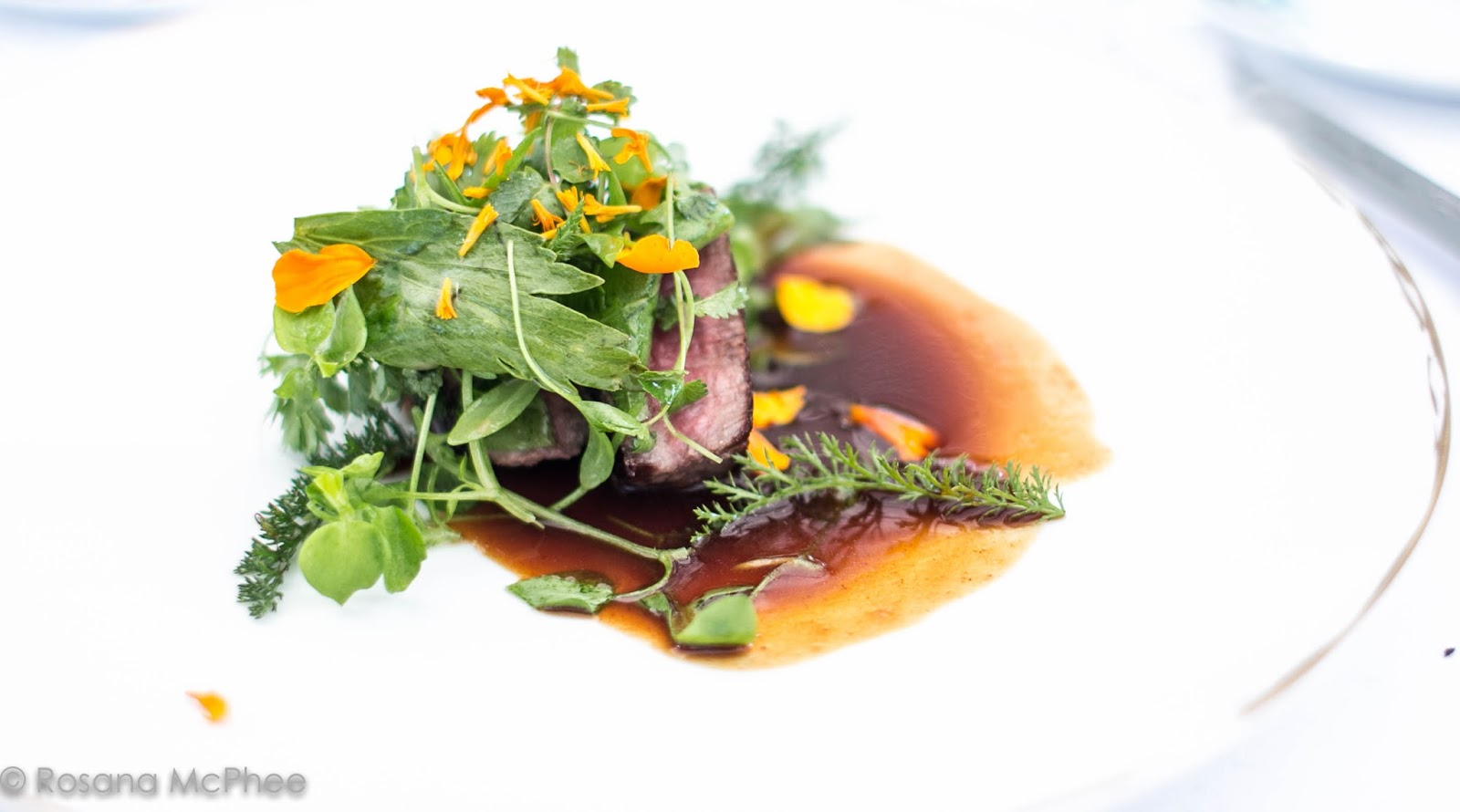 beef smoked with juniper berry on the plate, beautifully presented and very juice meat with herbs and edible flowers |