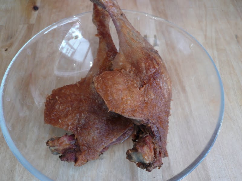 Step 10  Wash off the salt mixture by rinsing well under running cold water and confit the legs in oil by placing the legs in a small but deep ovenproof container