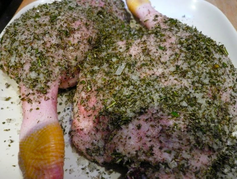 Step 8   Put the salt into the food processor with the herbs and blitz until well combined. Rub the mixture into the duck legs well and leave in the refrigerator overnight
