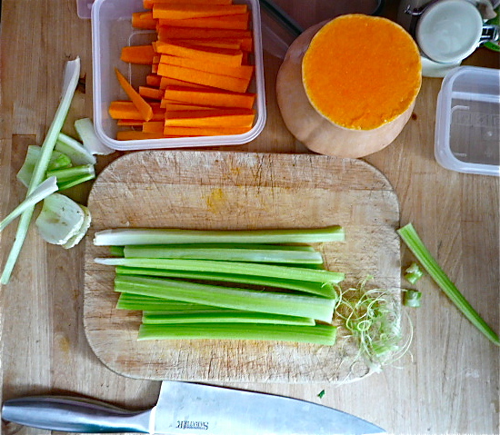 Step 13  Peel and cut the butternut squash into batons of equal thickness and round the edges of each piece off. Roast in the oven with a little oil and salt and pepper for 20–30 minutes