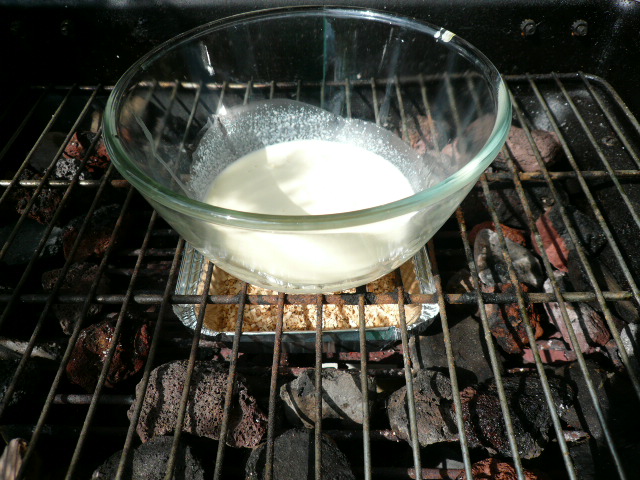 Step 20   Put enough hickory wood chips on a thick roasting tray to cover the tray. Place a cooking rack on top and put the bowl of cream on the rack
