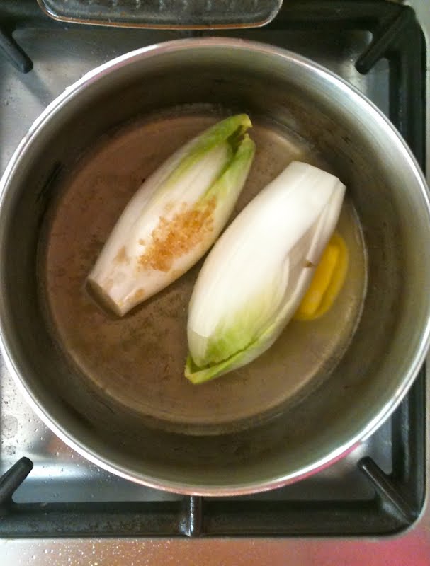 2 medium heads of chicory, 2-3 tbsp boiling water, 1 tbsp sugar, small knob of butter