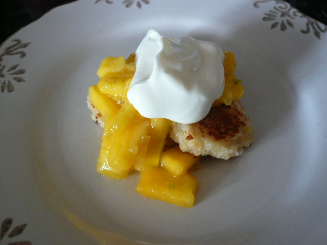 | Coconut pancake topped with mango, lime, crystallised ginger and creme fraiche |