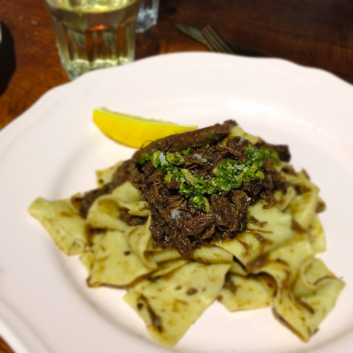 | Braised wild rabitt with smoked bacon and prunes with homemade pappardelle topped with salsa verde |