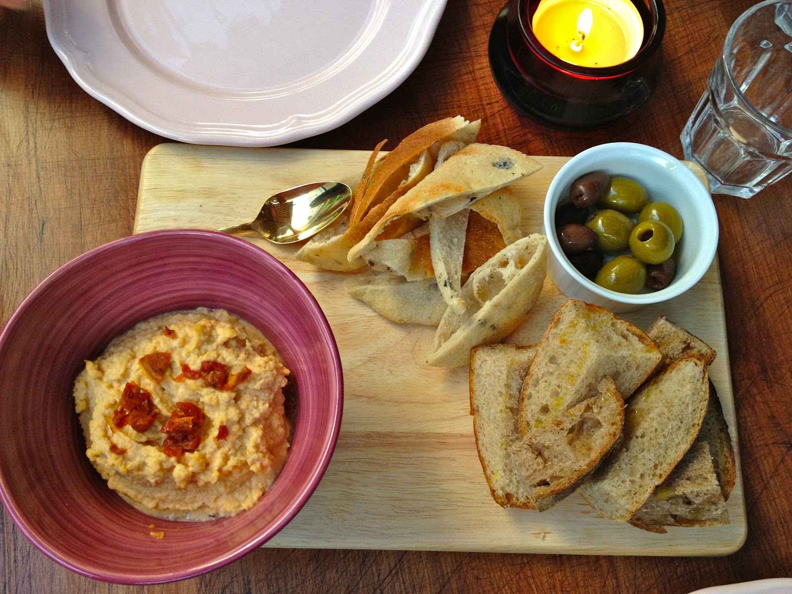 | Roasted garlic and sundried tomato hummus with organic and sourdough bread |