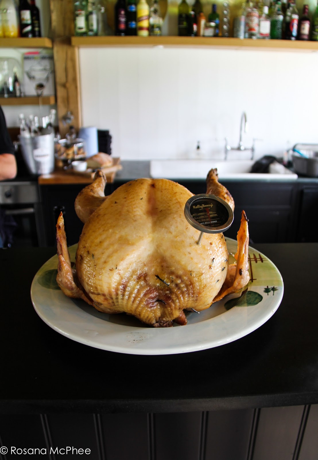 – very important and useful is the use of a meat thermometer to check when the turkey reaches 65C. Once it reaches this temperature the turkey is ready, regardless of having some blood running through.