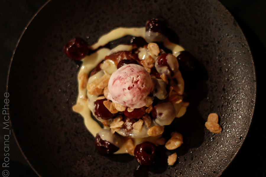 Cherry Clafoutis, made with almonds – gluten-free, topped with cherries ice cream and caramelised almonds, Restaurant Joy in Hyères |