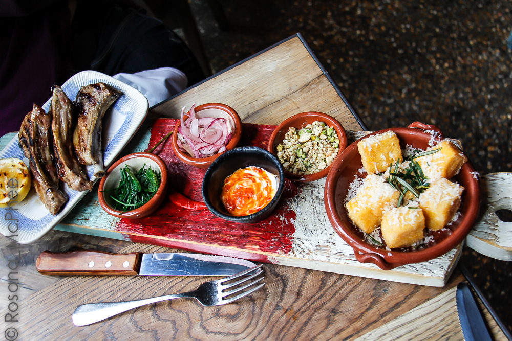 | A lovely plate of cured meats plank I shared with Jeanne: fennel salami, pistachio mortadella- my favourite, prosciutto & schiacciata piccante served with mini buffalo mozzarella, pecorino & chilli jam on crisp flatbread, a selection of pickles, olives & crunchy and very tasty vegetable slaw (£13.90 for two) |