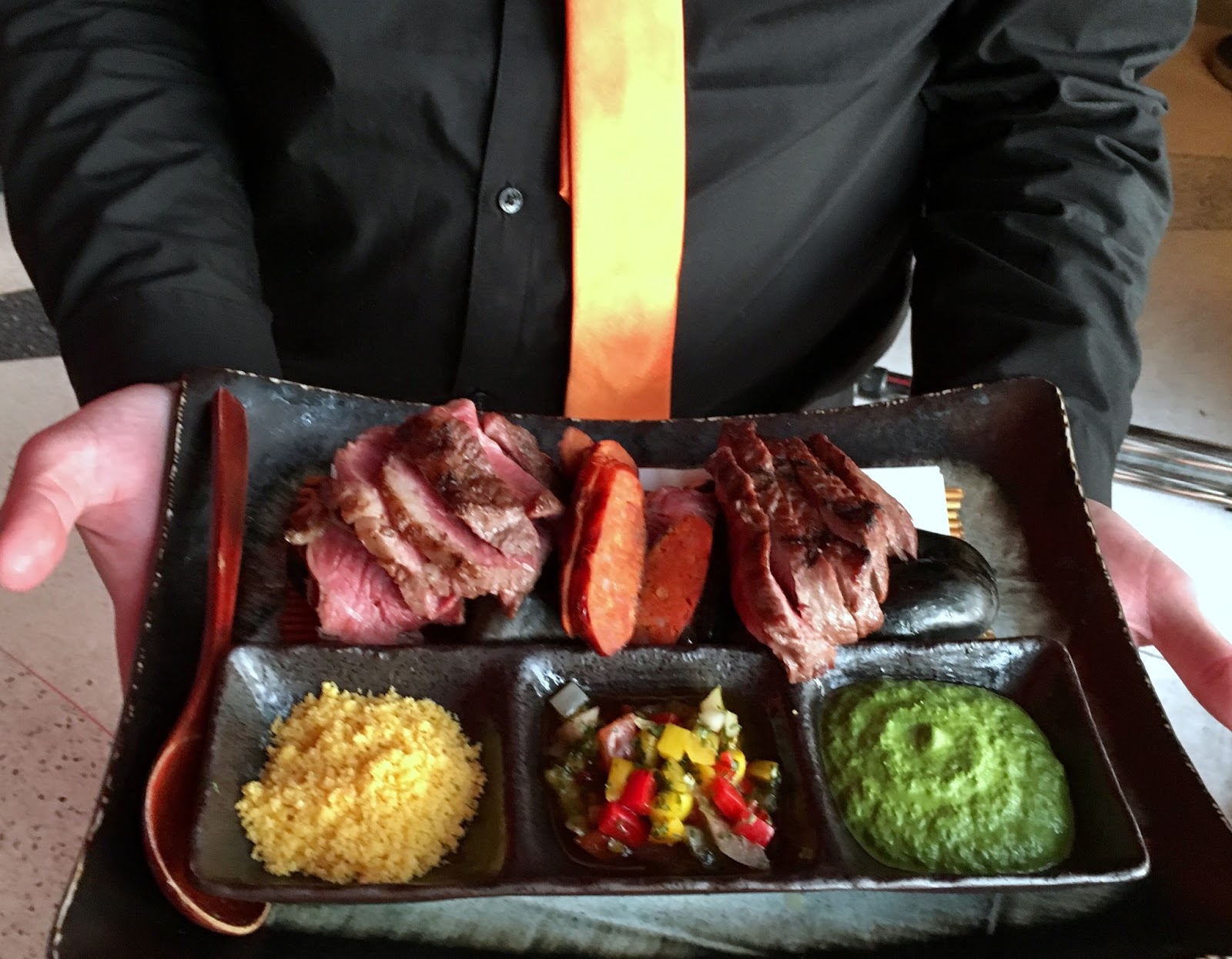 Churrasco Rio Grande, rib eye, chorizo, waguy picanha, cassava flour, vinaigrette and Chimichurri paste.