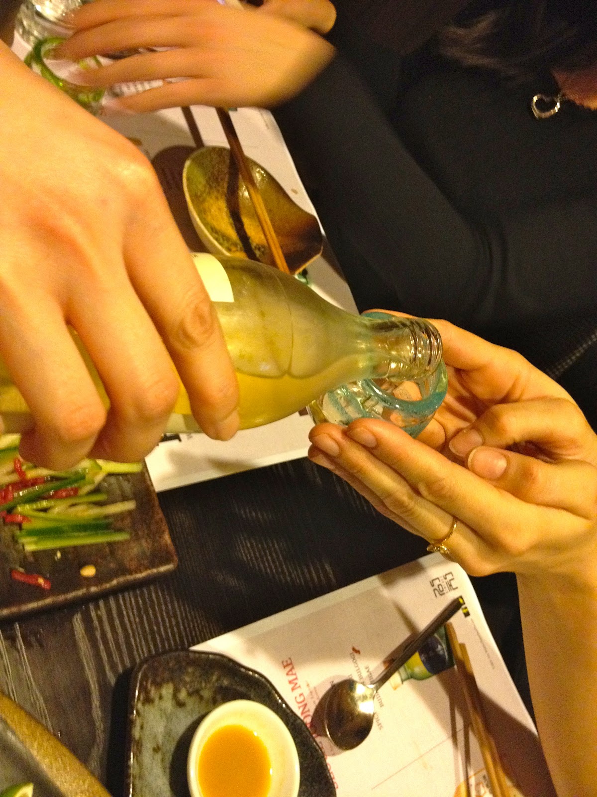 Below left: beef mari – packed with flavour, below right: pouring and receiving drinks Korean way