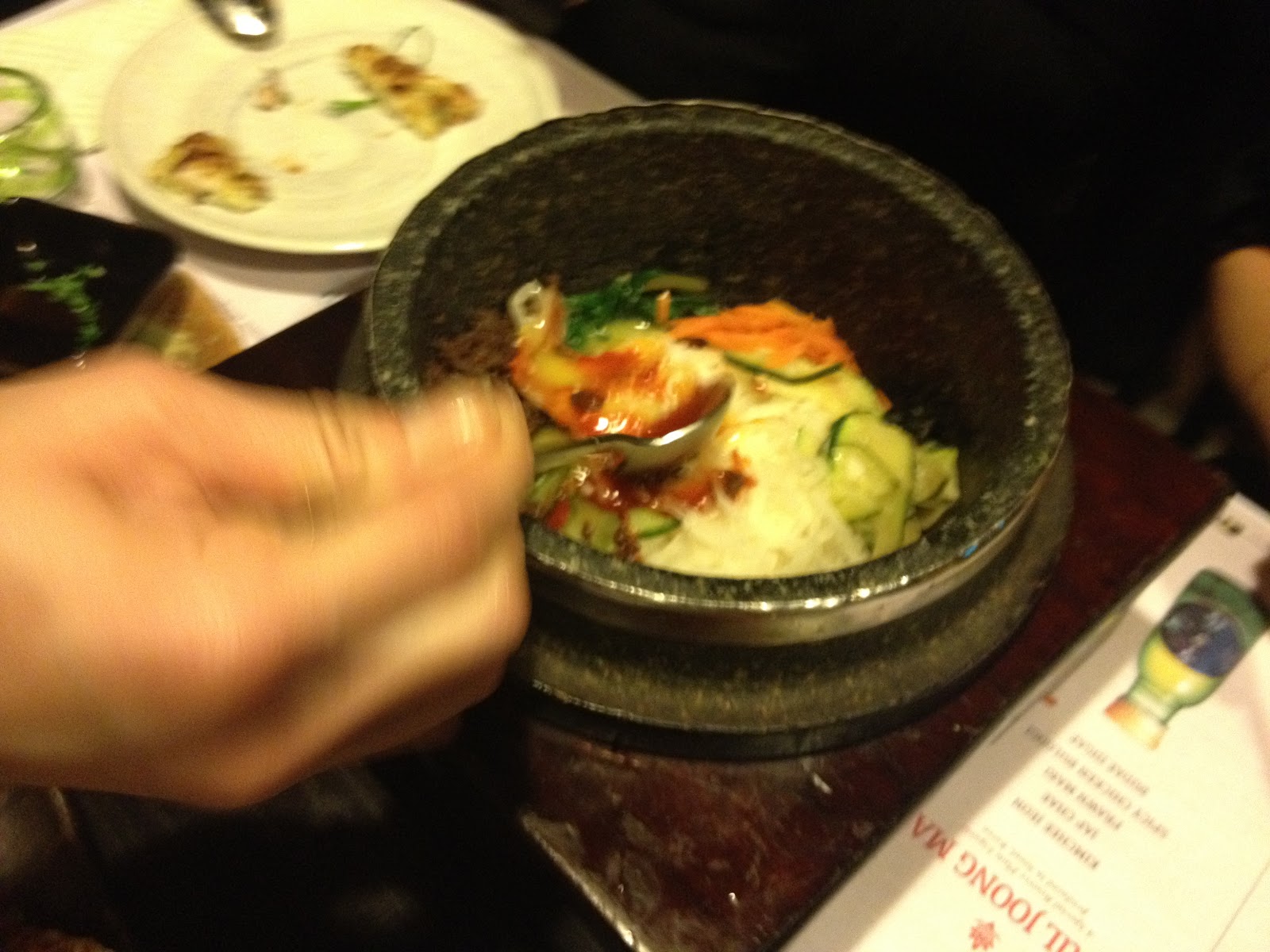 dolsot bibimbap bowl- cooked and served in a stone bowl, adding the chilli paste will add more flavour and some heat to this dish.