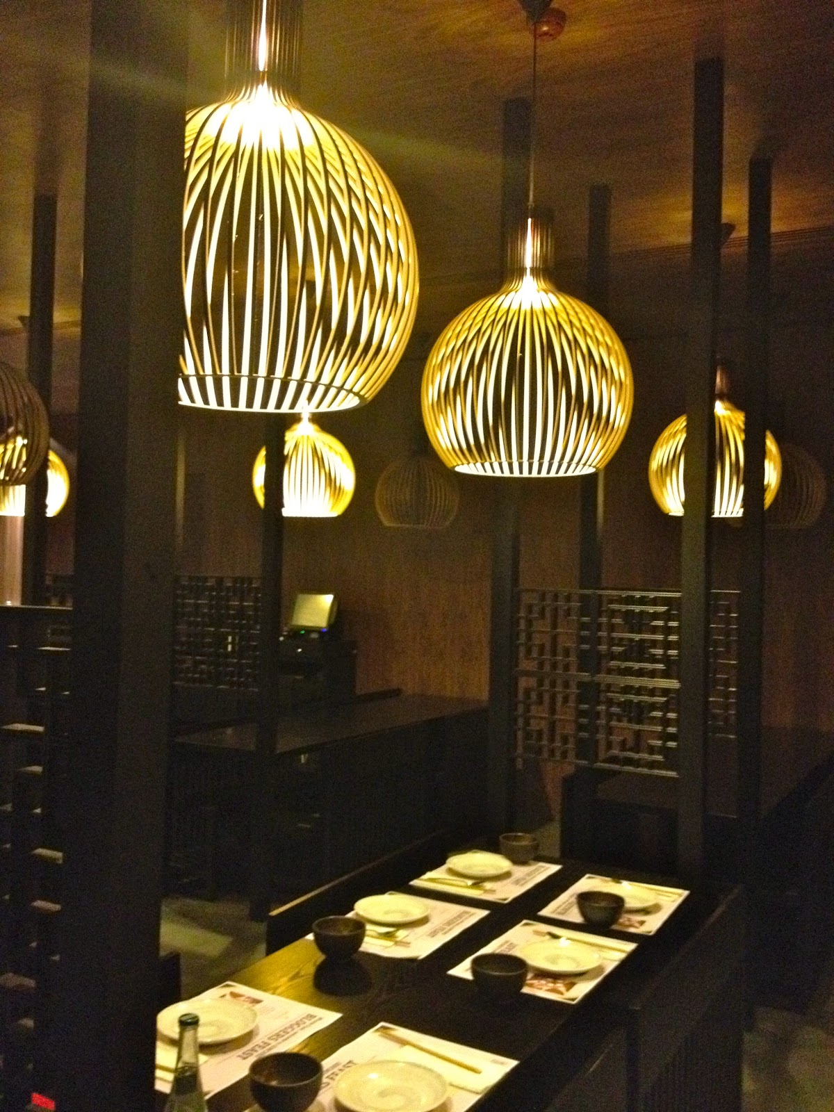 Kimchee was designed with the oriental home feel in mind with clean and graphic lines, dark wood lattice panelling and cedar wood lamp shades, including an oriental internal garden by the entrance. The kitchen is enclosed by glass panels so you can watch all the magic and action in the kitchen as it happens. The restaurant upstairs was buzzing on a Tuesday night.