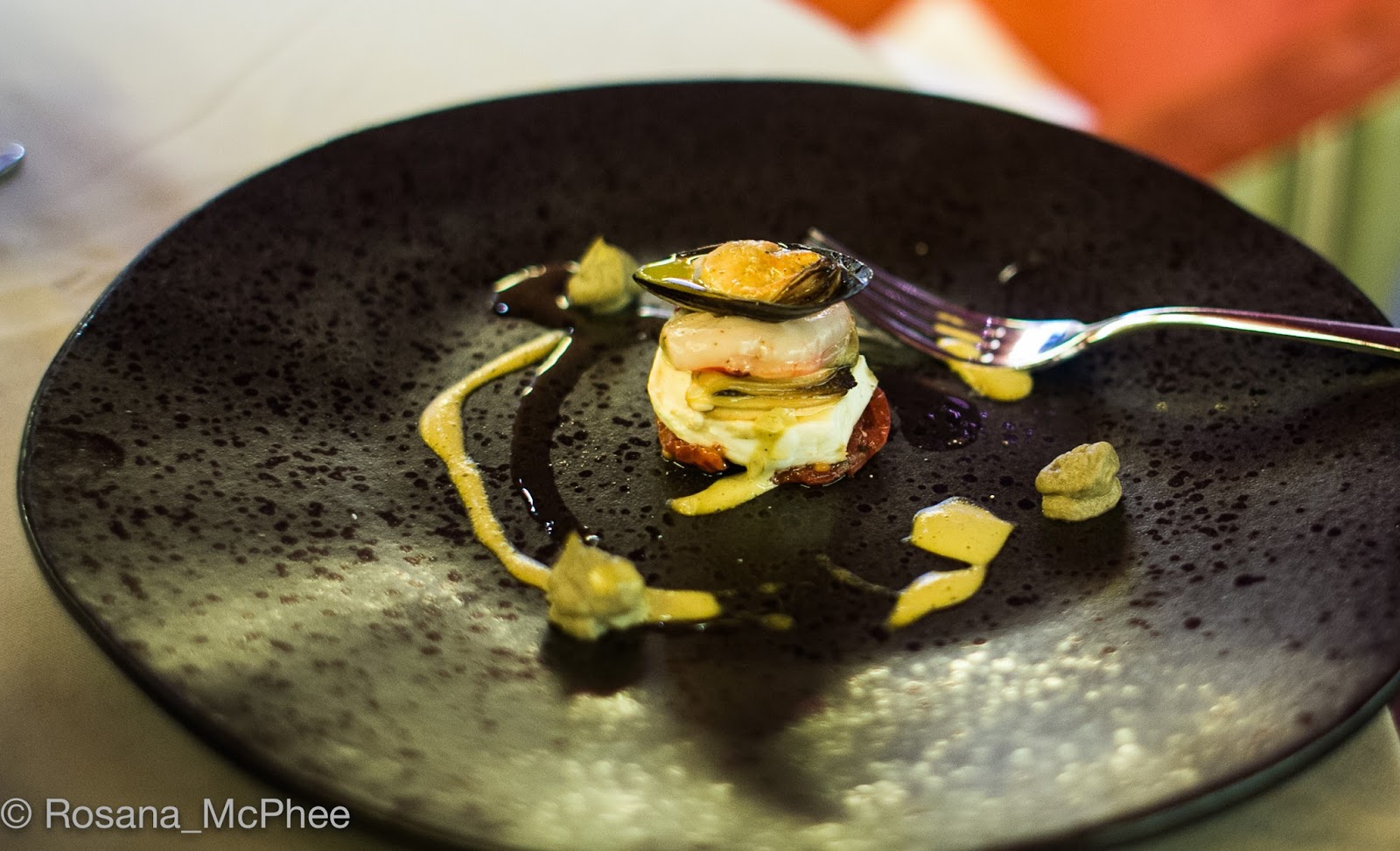 Mozarella, prawns and fermented turnips cocoa sand by Roberto Petza