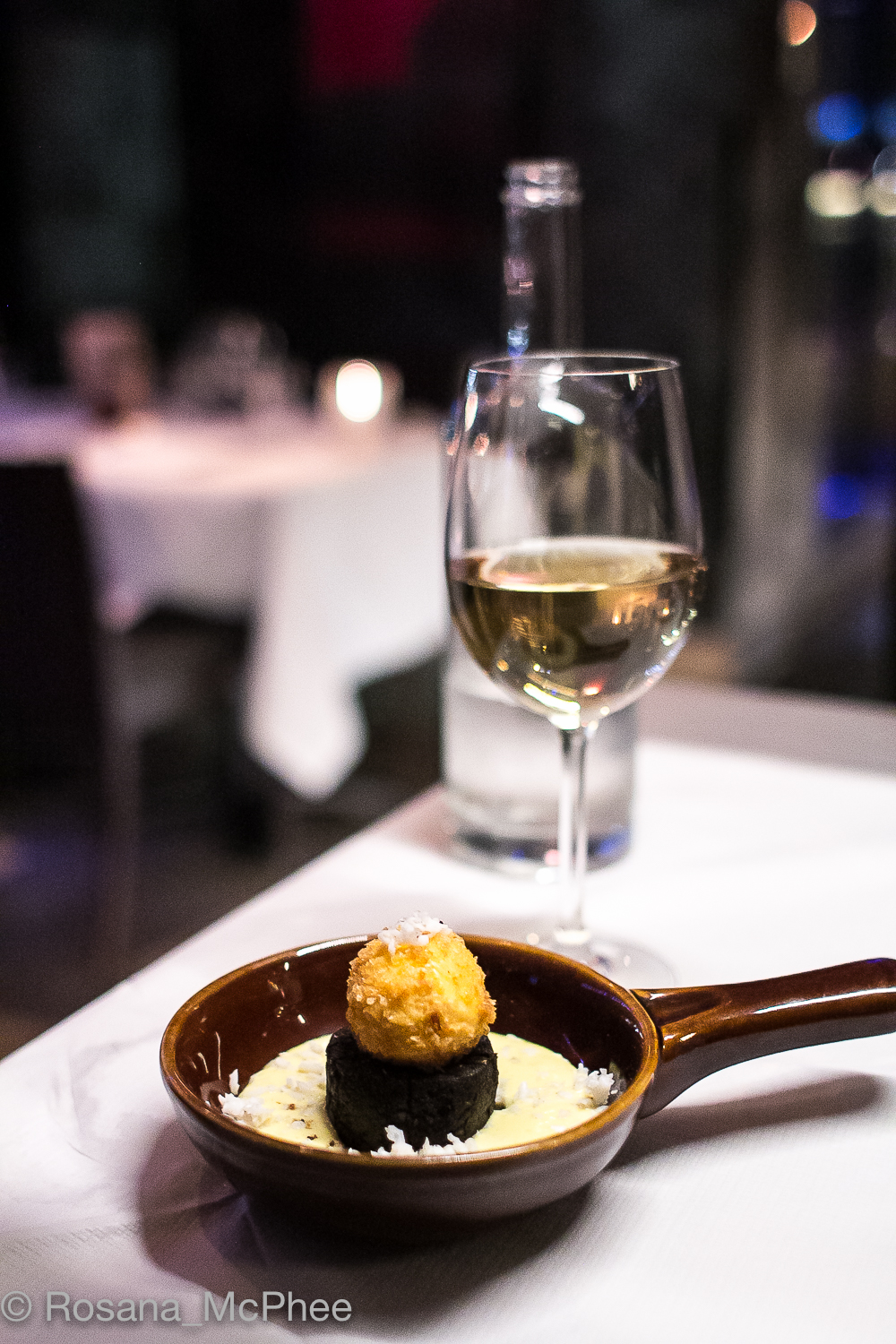 Truro Black Pudding with Crispy Duck Egg Yolk, Potato and Mustard Mousse – what a fantastic choice by Cooksister! and beautifully presented and tasty!