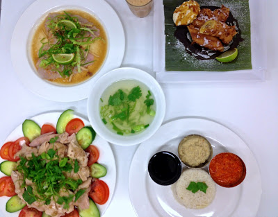 An English and Oriental menu a cracking roasted pork belly with two mashes, a fresh and fruit salad and sweet wonton for desert