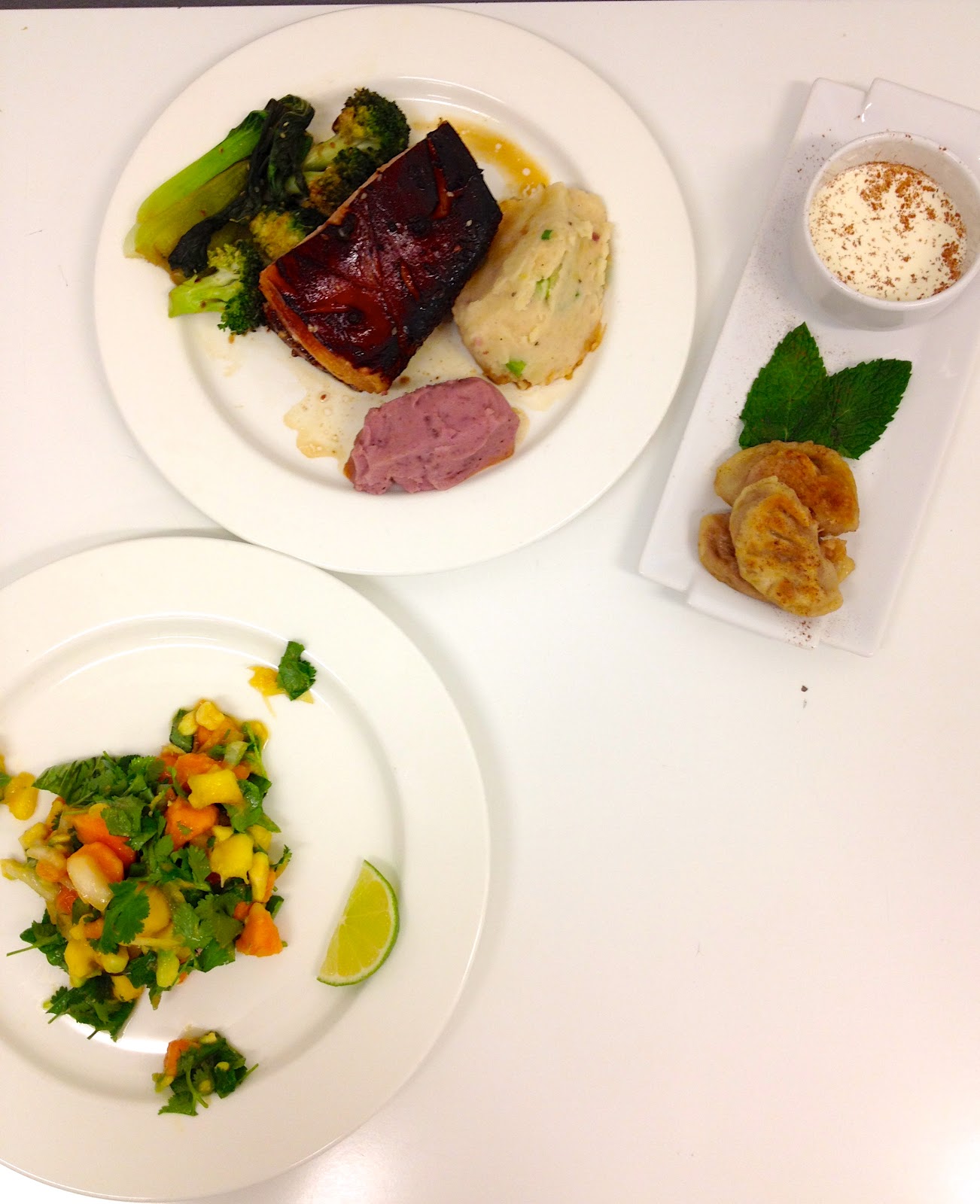 An English and Oriental menu a cracking roasted pork belly with two mashes, a fresh and fruit salad and sweet wonton for desert