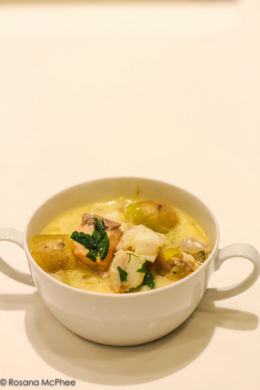 Norwegian seafood winter warmer chowder deluxe, salmon and fresh cod pieces. in a double cream chowder with diced onions, celery, carrots, leeks, brandy and dill pollen and potatoes. I decorated my plated dish with parsley, usually it’s sprinkled with dill, the Norwegian way.
