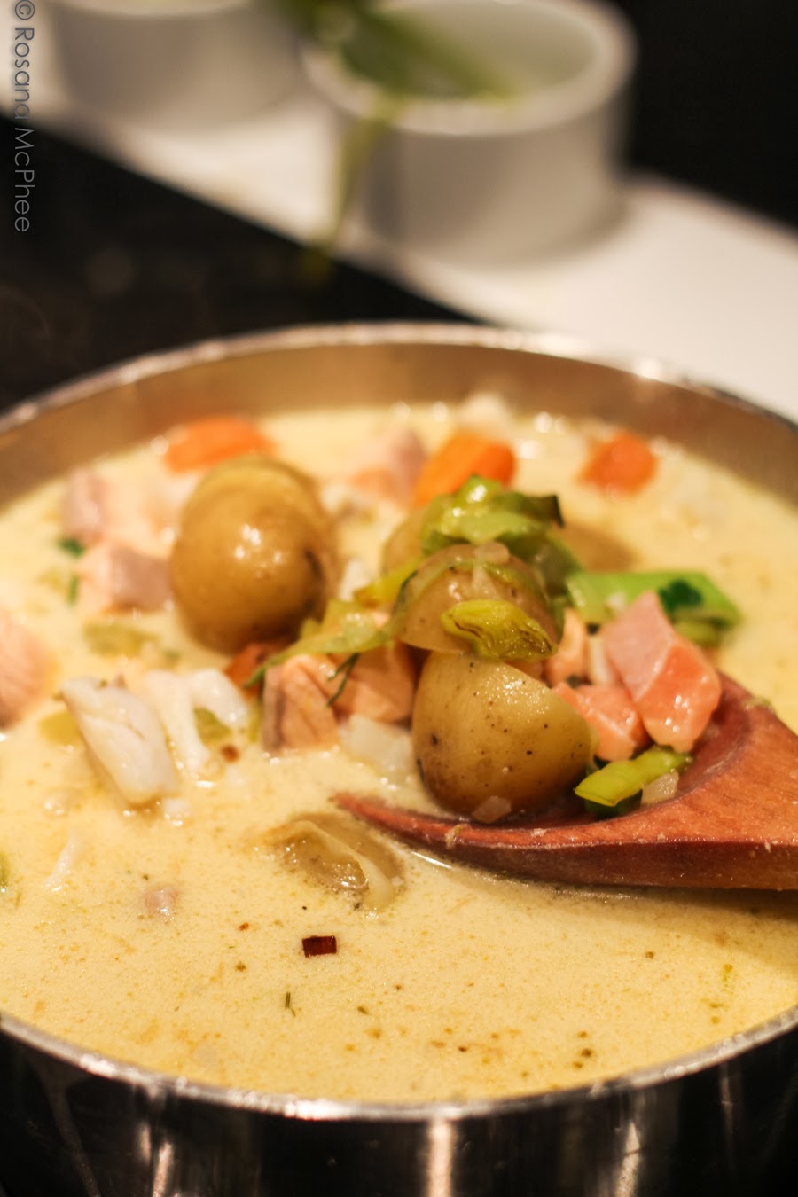 above left: Norwegian smoked salmon with pickled beetroot, cucumber pickle, horseradish creme fraiche (mixture of half horseradish and creme fraiche) decorated with dill. Above right: our delicious seafood chowder almost ready…