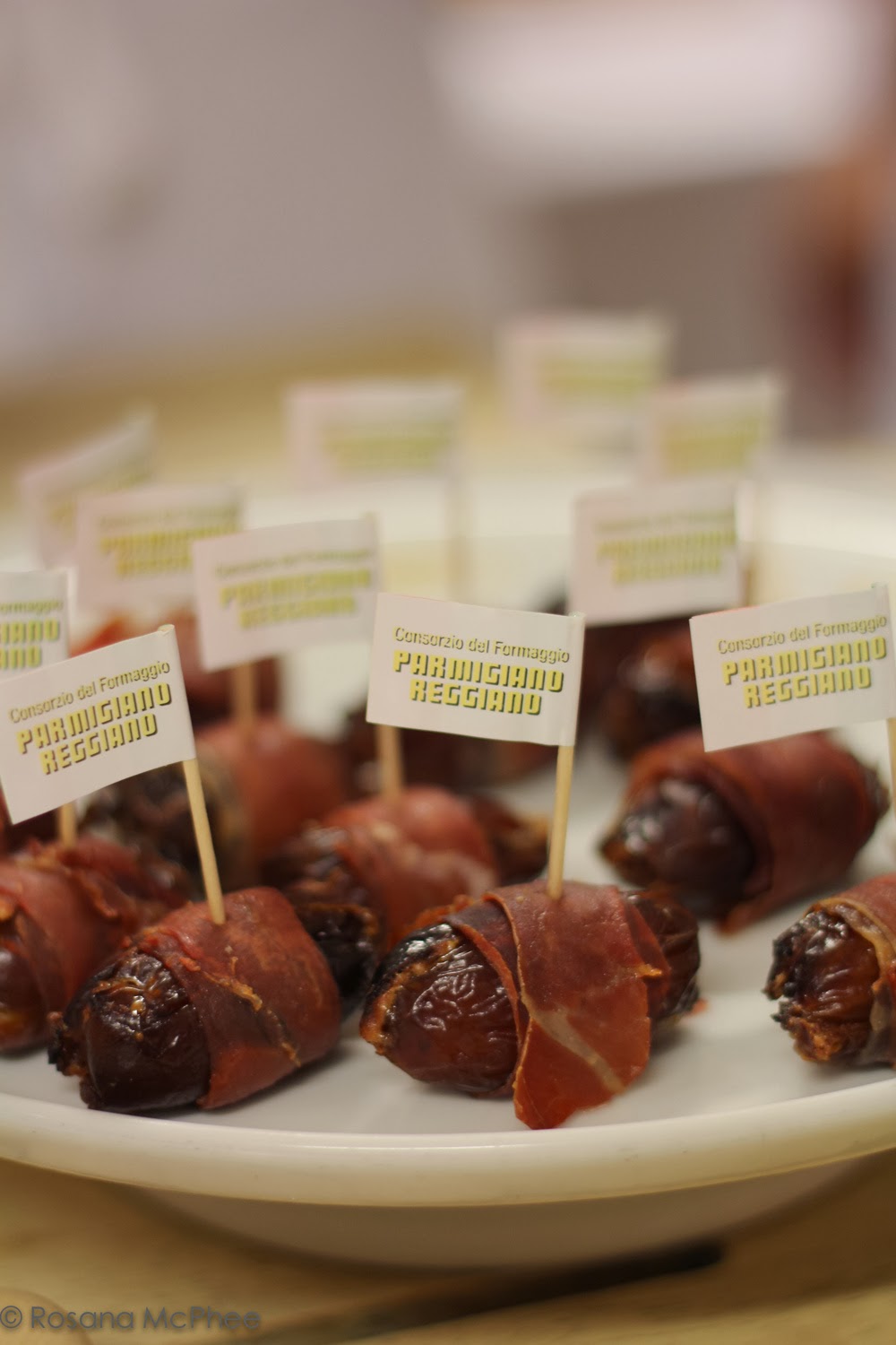 spicy Parmegiano Reggiano lollipops, datteri al prosciutto – dates wrapped in Parma ham and filled with Parmegiano Reggiano (quite salty, but went down a storm) and a selection of 24 months and 36 months aged Parmegiano Reggiano with Balsamico to dip in