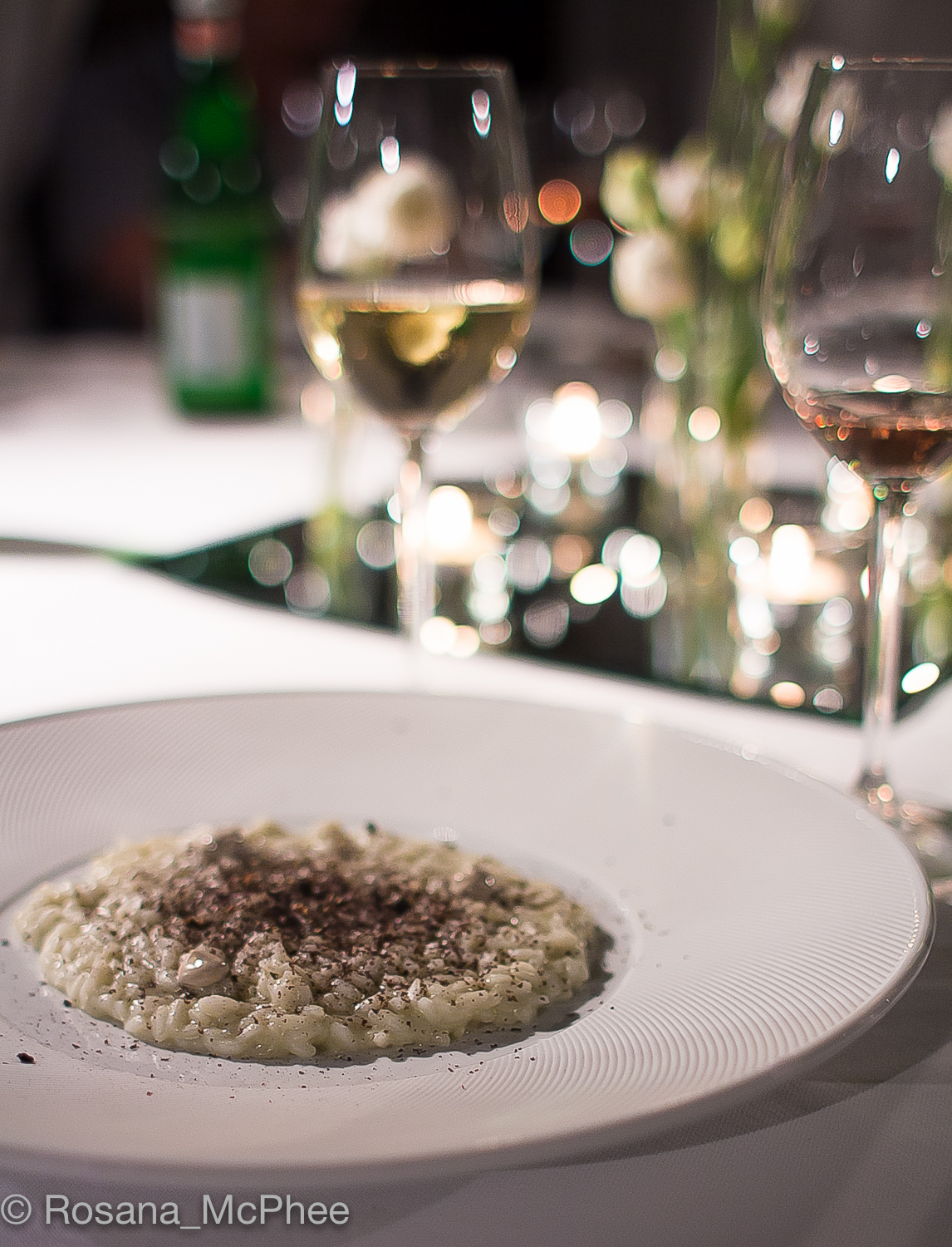 | Carnaroli rice, pistacchio, shavings of dark chocolate, Sarawak pepper and anchovies cream |