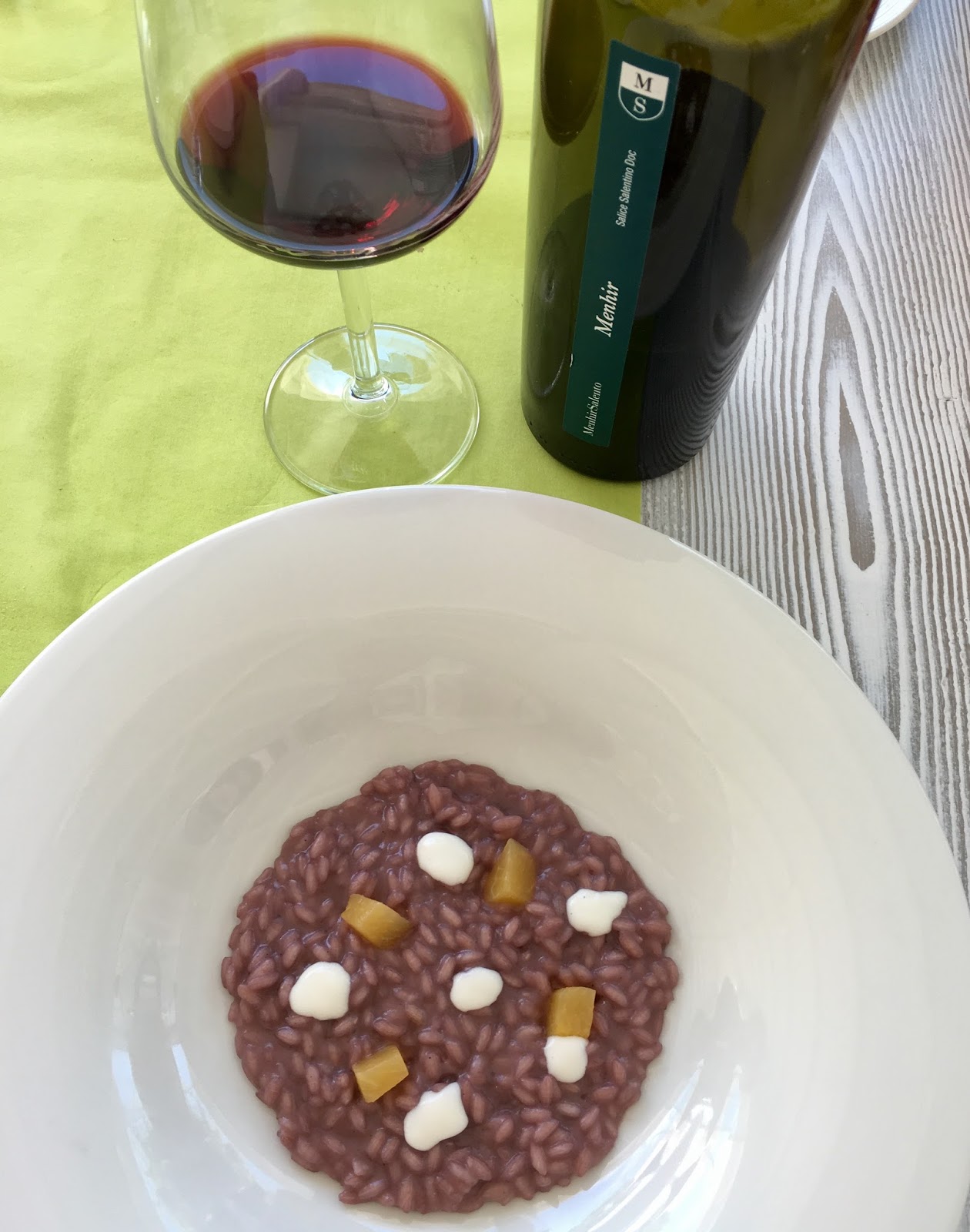 | Risotto negroamaro cheese and peachesmatched with Red Menhir -80% negroamaro 20%malvasia nera from Salice Salentino |