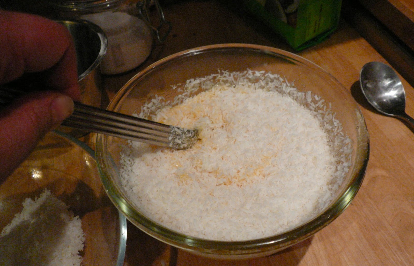 It’s a custard like mixture with coconut and vanilla and baked in the oven.