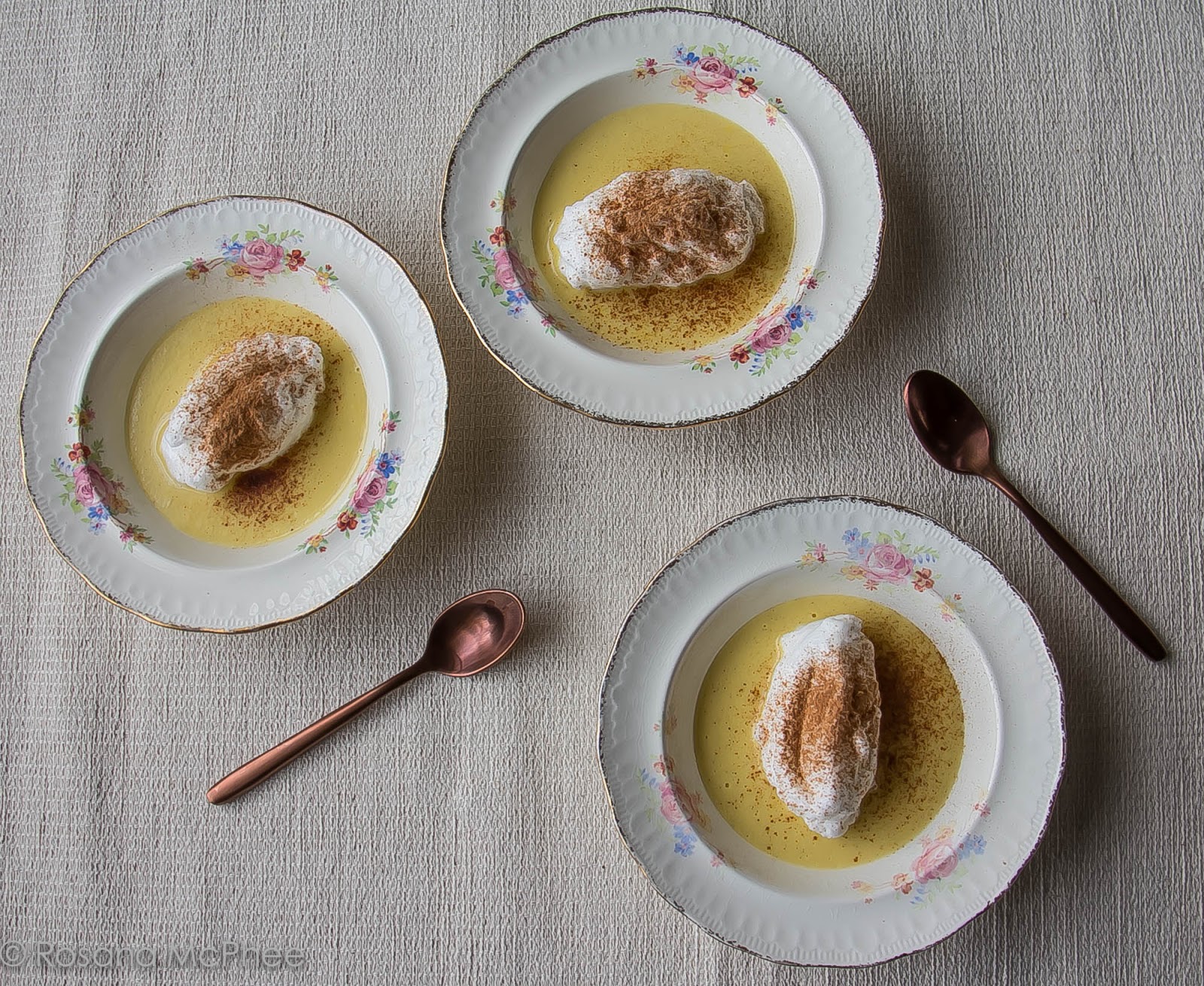 My mum used to prepare this recipe at least once a month for a weekend treat. At the time, she placed each individually cooked meringue in a large deep porcelain bowl, very similar to the one below but large! And we would help ourselves. I just adore the silky yellow cream with speckles of vanilla seeds.