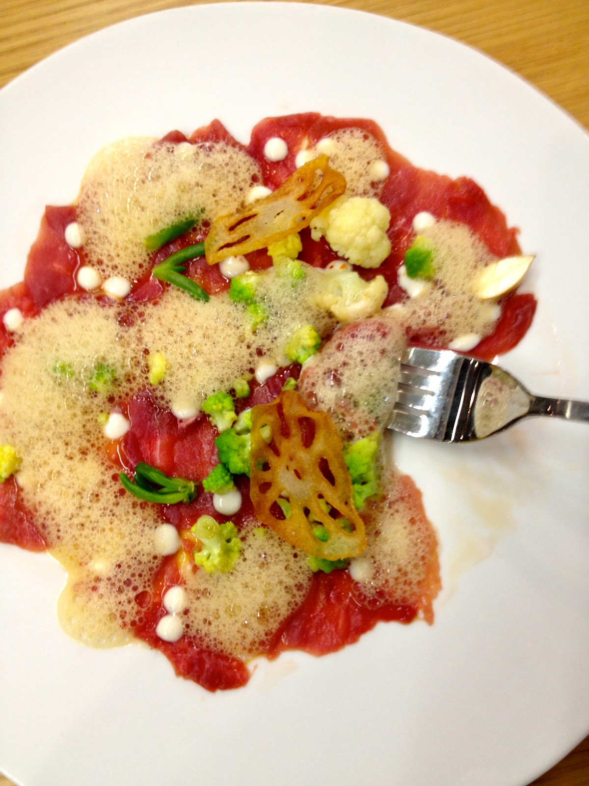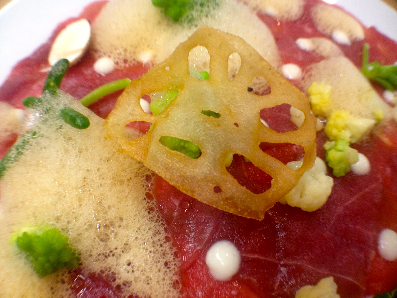 | duck carpaccio with sea urchin and romanesco cauliflower |