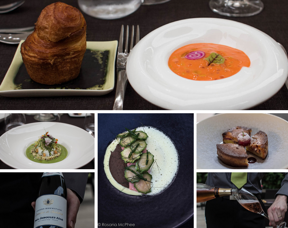 restaurant Le Carré d’Aléthius :  Carrot emulsion olive and seafood; Asparagus emulsion, sous vide egg  and cucumber, Salmon aubergine mash, coconut emulsion and Samphire, local wines.