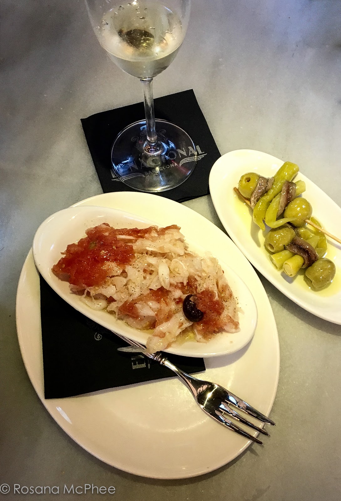 | Esqueixadas (Cod & tomato salad) | Gildas (Mini skewers of green peppers,olives and anchovies) |