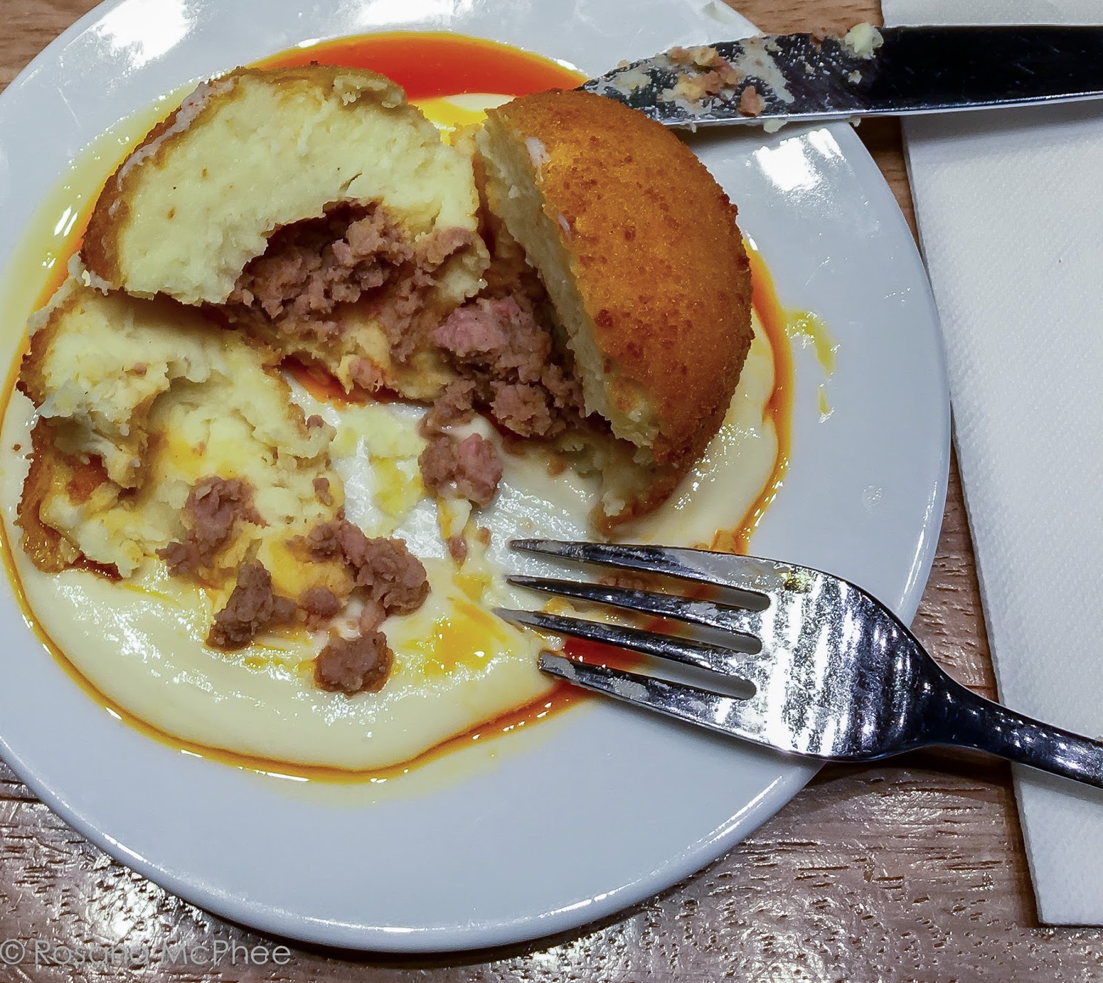 | La Bombeta de la Barcelonetta : mash potato balls filled with meat on a pool of aioli, spice tomato sauce and chilli oil – Delicious! |