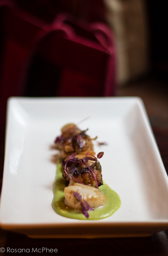 | Seared King Scallops with juicy and tasty rabbit and sage meatballs and garden pea puree |