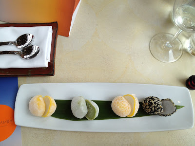 | A selection of soft Japanese rice cake filled with ice cream: mochi – mango, green tea, pineapple and sesame – it was a nice end to our meal. |