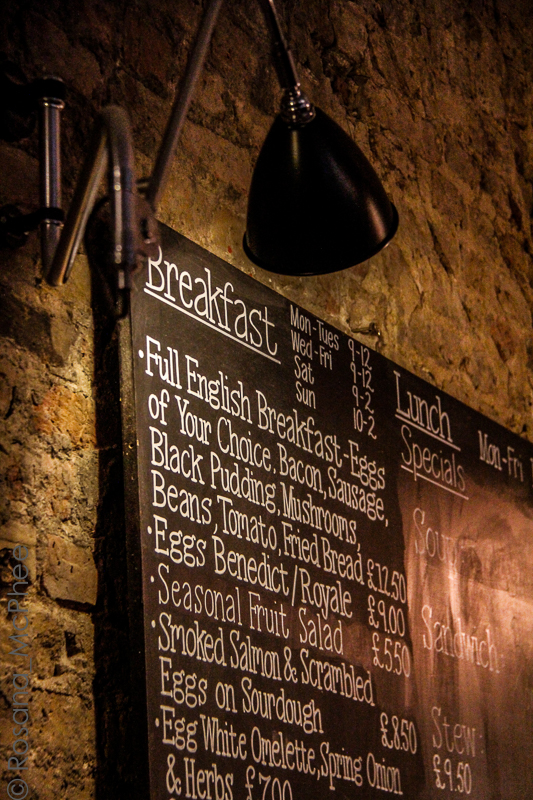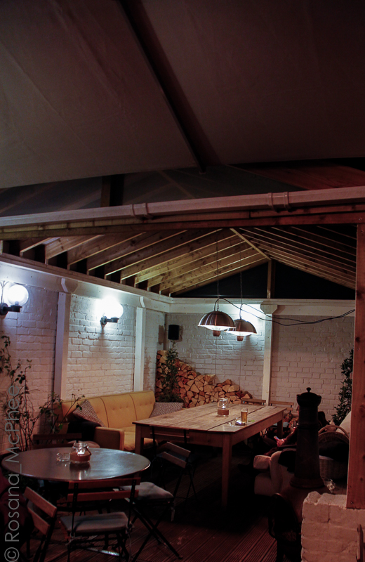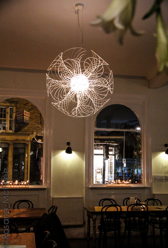 As you enter the premises, it feels spacious and welcoming.  The place is divided into three ambient; the fully licensed bar is the focus of the first room. A striking wine hack hangs on the bare brick wall leading to the second area with more wooden tables and chairs where you can see the open kitchen and watch all the action.  The double glass doors lead to a sun-trap ‘garden’ furnished with sofas, a small herbs and vegetable area and a pretty  dinning all fresco area.
