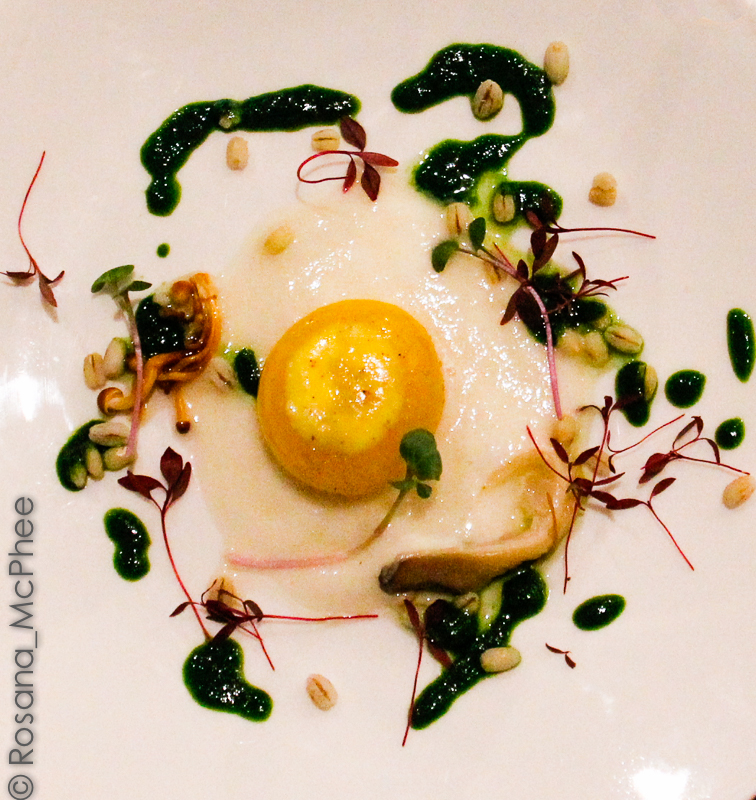 Such a pretty dish: confit duck yolk with very light taste hay-infused egg white, pickled mushroom and chive puree
